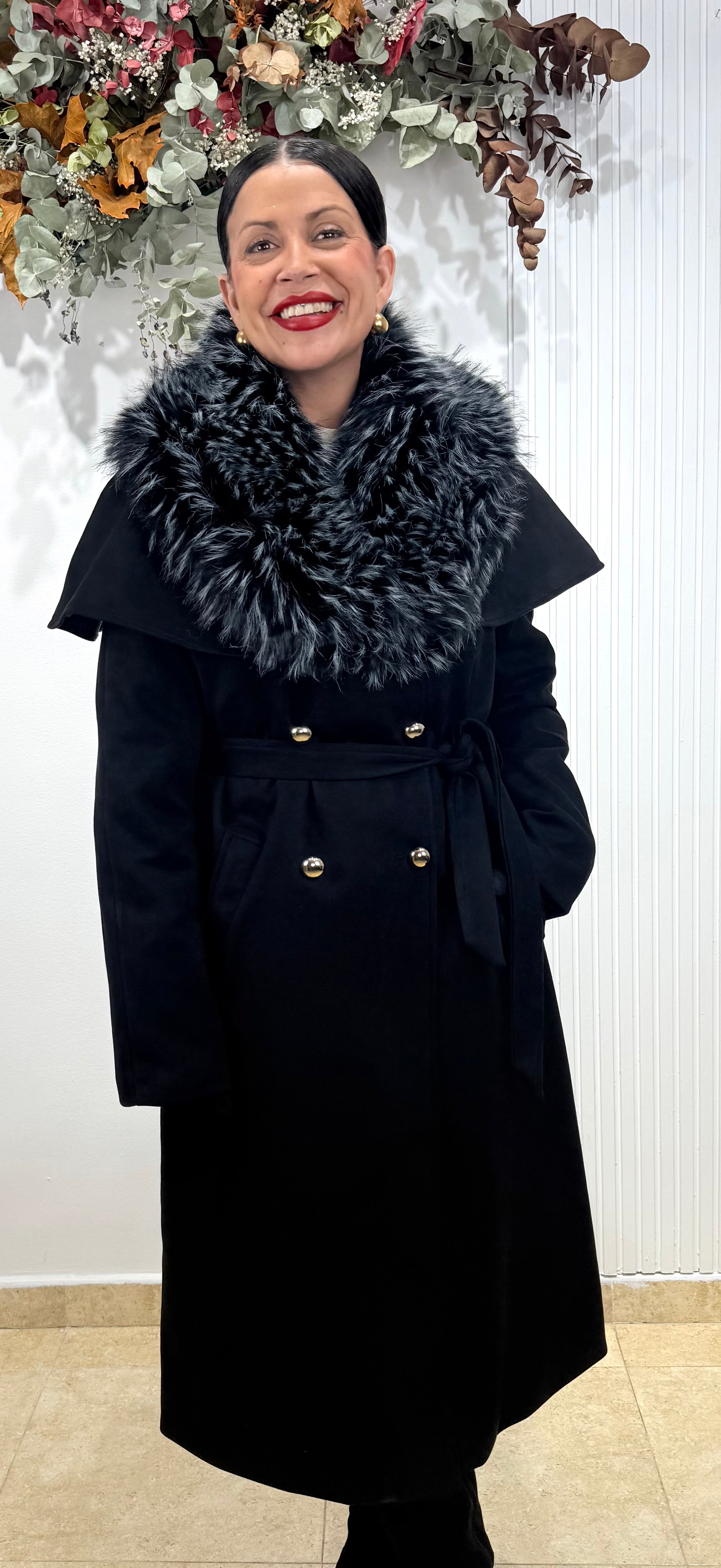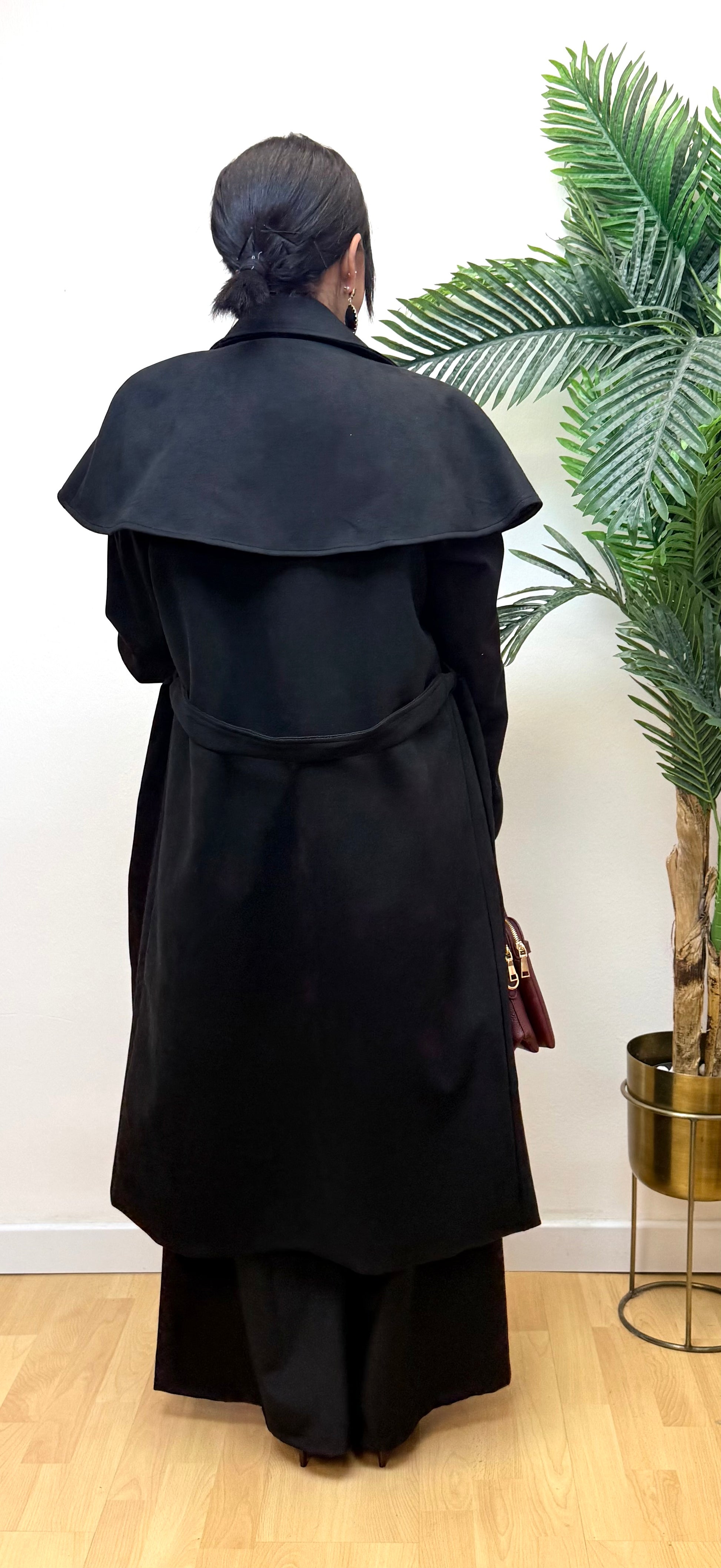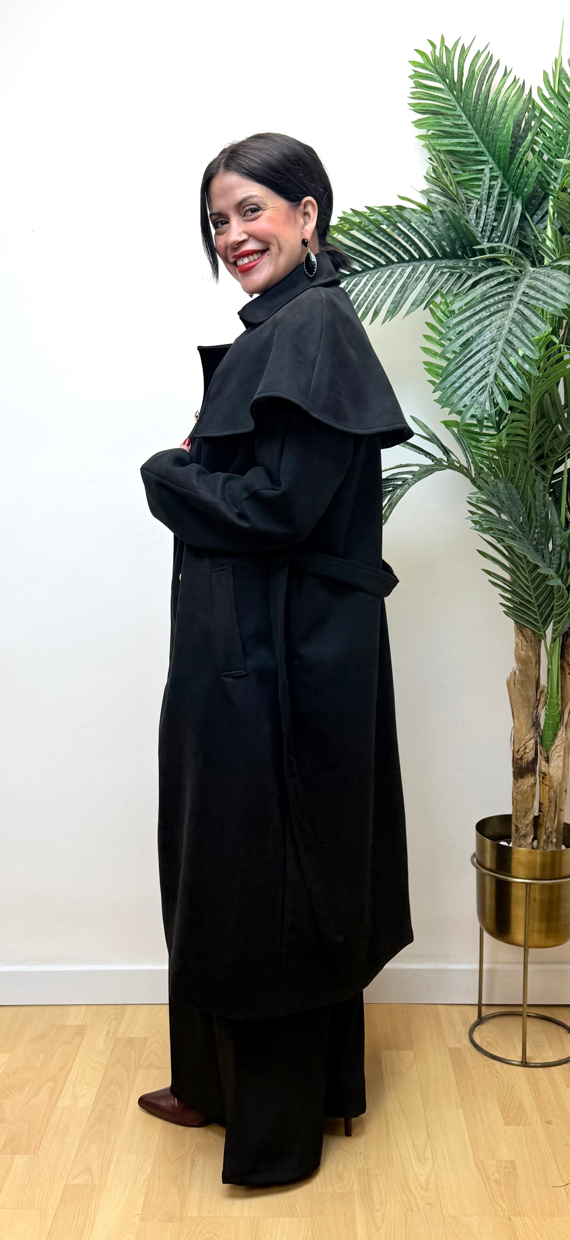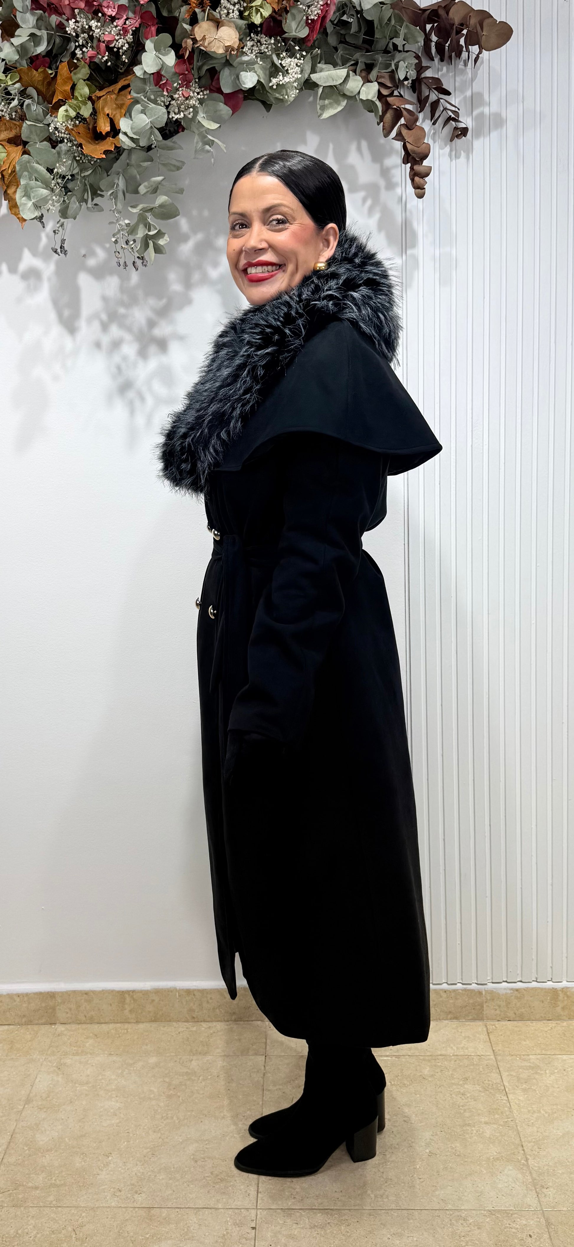 Abrigo Romina negro capa antelina, un abrigo elegante, forro, con capa, doble abotonadura en color dorado, con bolsillos forrados.