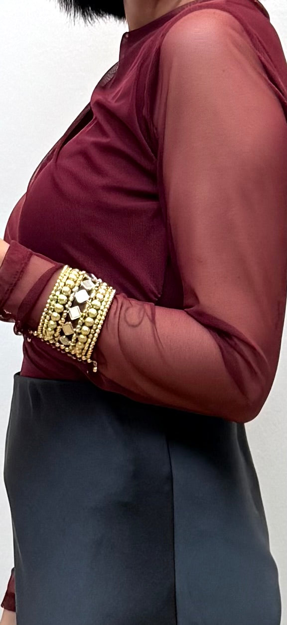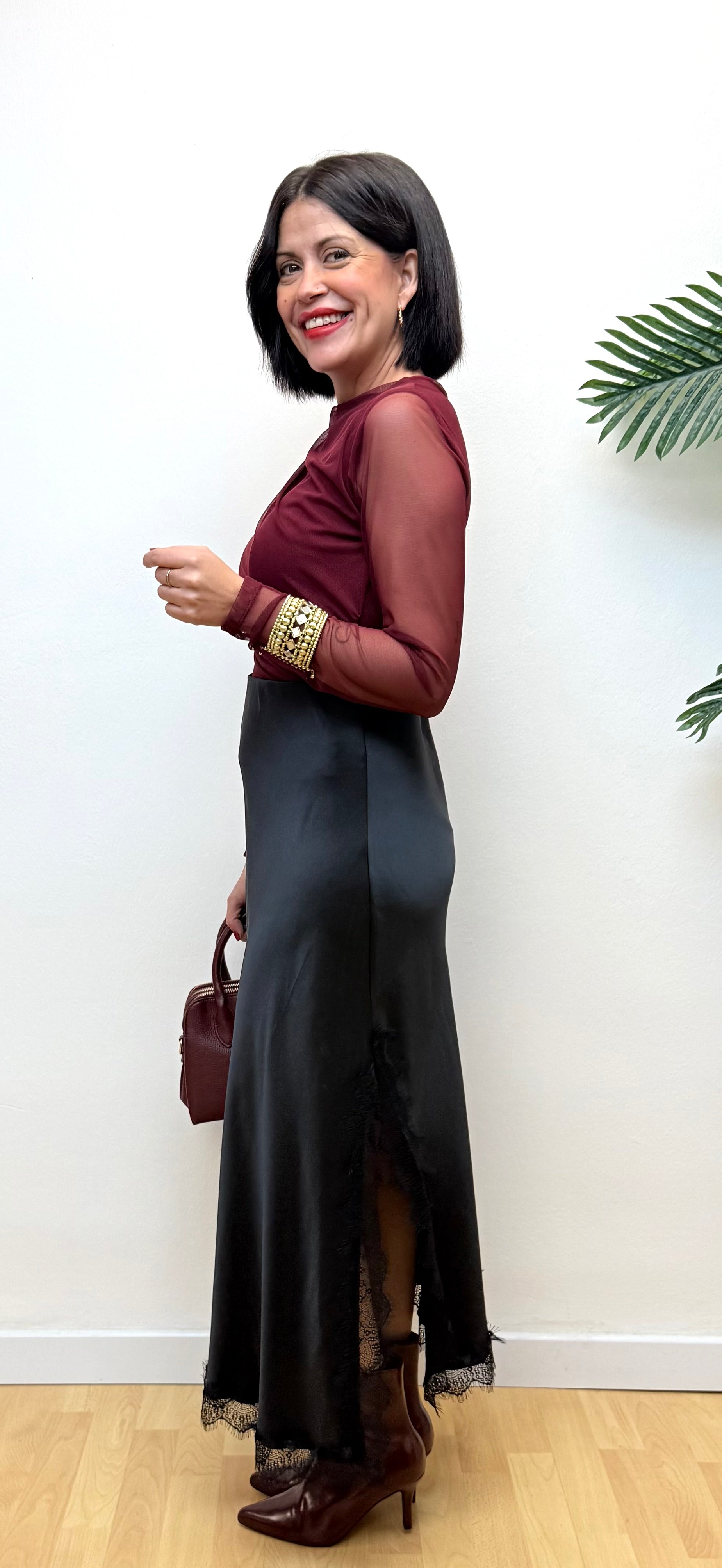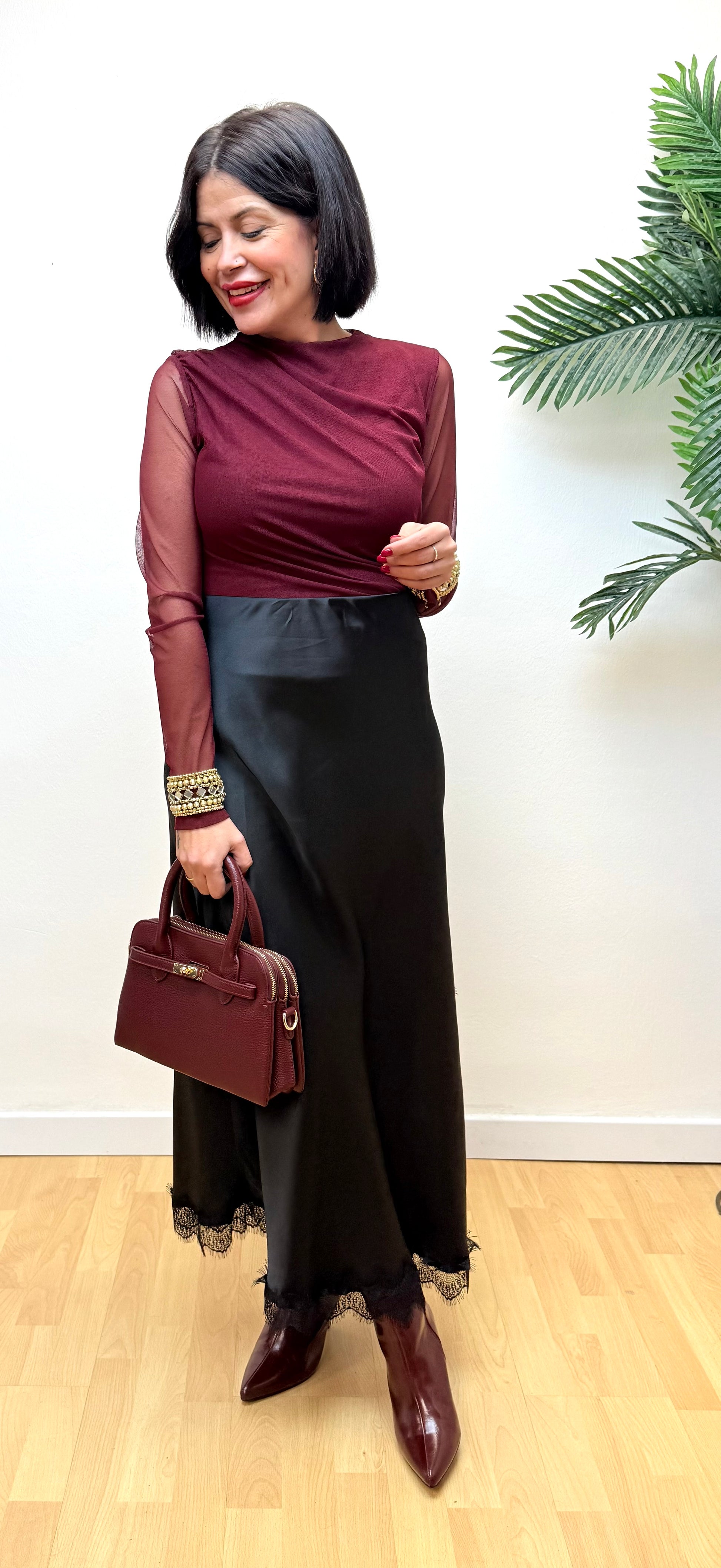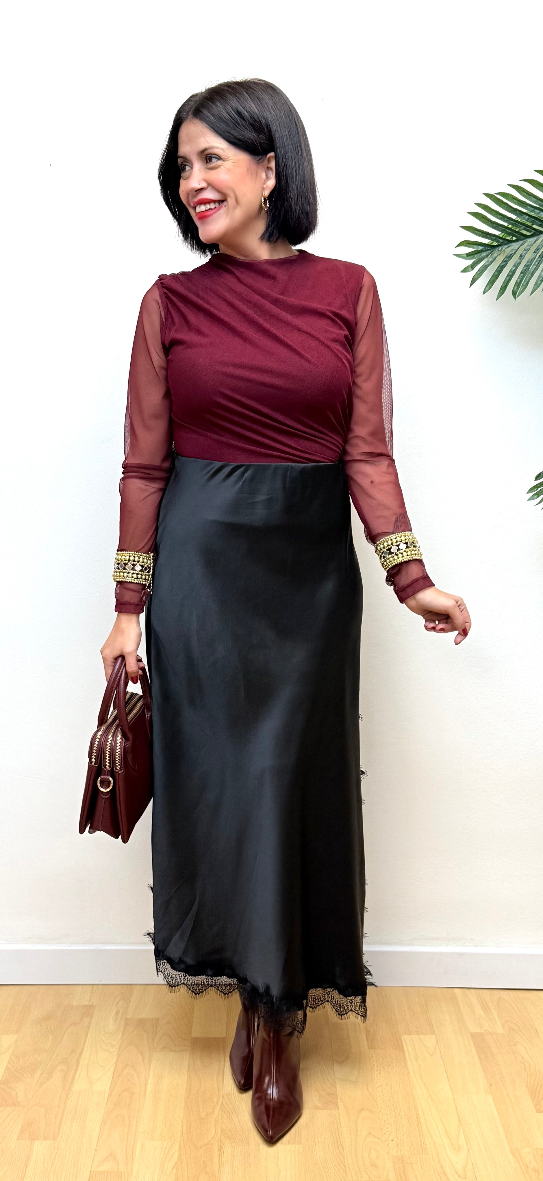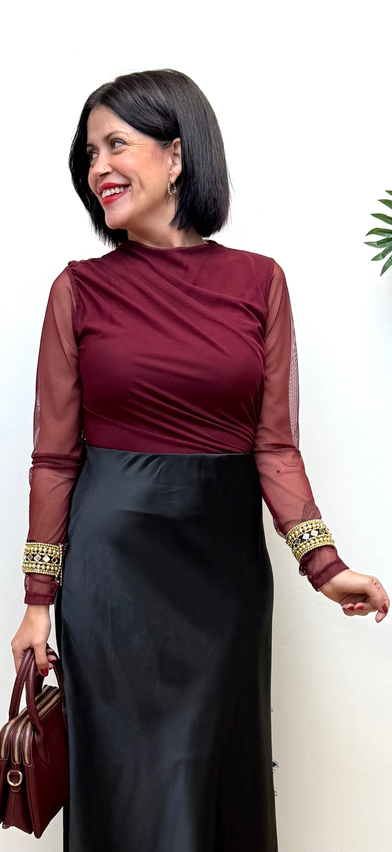 Body Burdeos Natacha, con un tejido de lycra y tul combinado que es sumamente bonito, la zona del cuerpo viene doble capa con y ademas con un fruncido que lo hace especial, con mangas semitrasparentes.