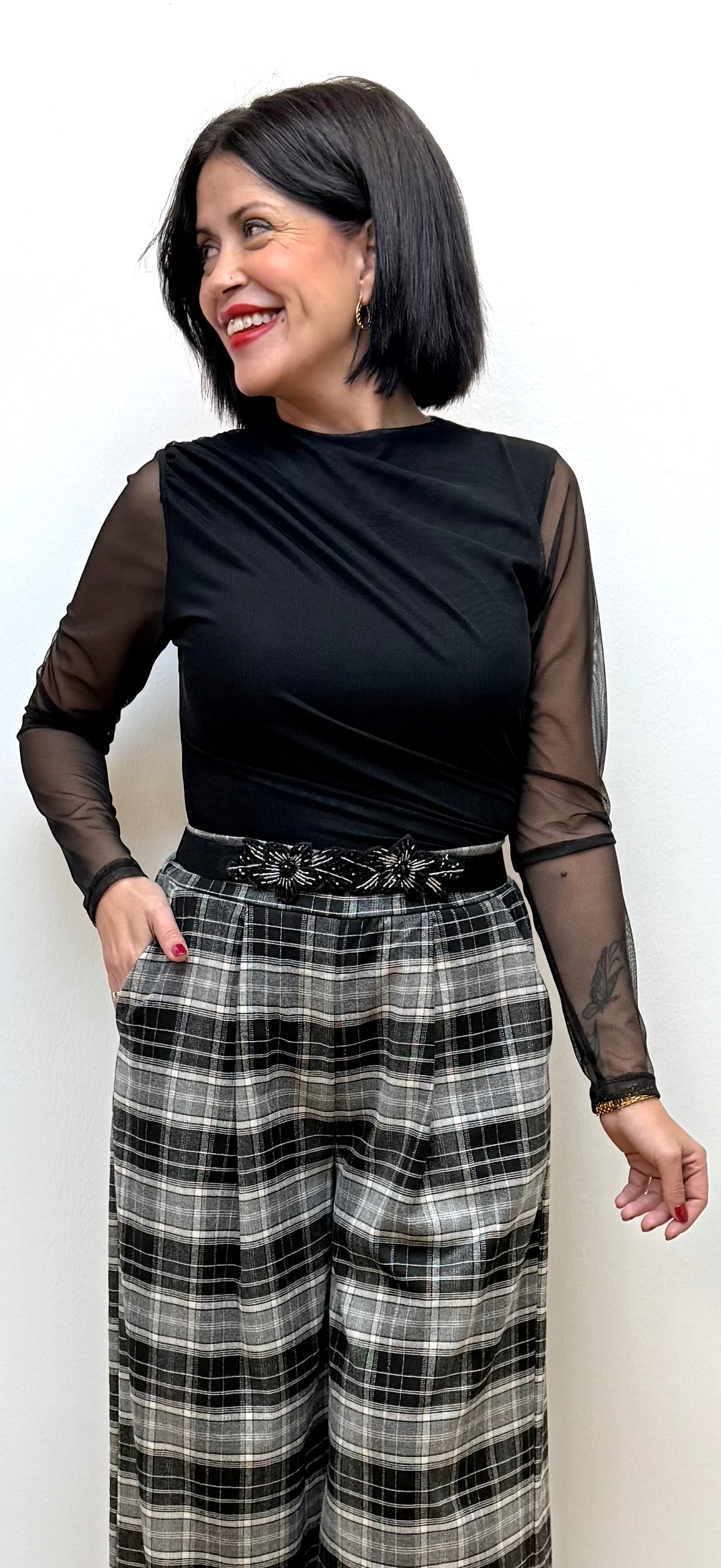 Body negro Natacha, con un tejido de lycra y tul combinado que es sumamente bonito, la zona del cuerpo viene doble capa con y ademas con un fruncido que lo hace especial, con mangas semitrasparentes.