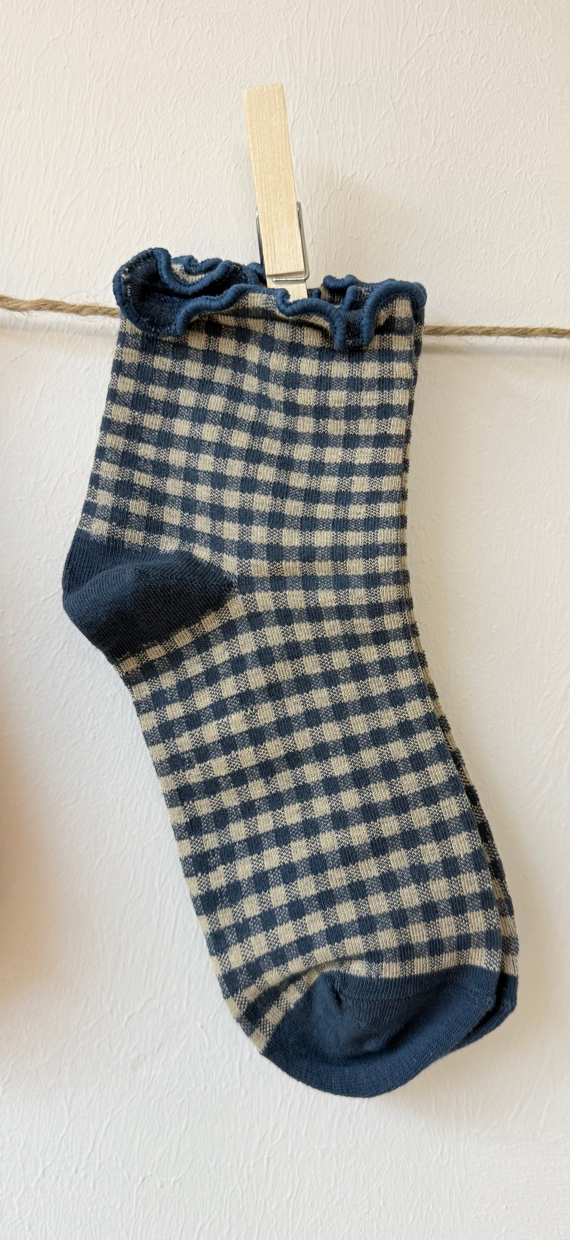 Calcetines Cayetana azules, con estampado vichy y volantes.