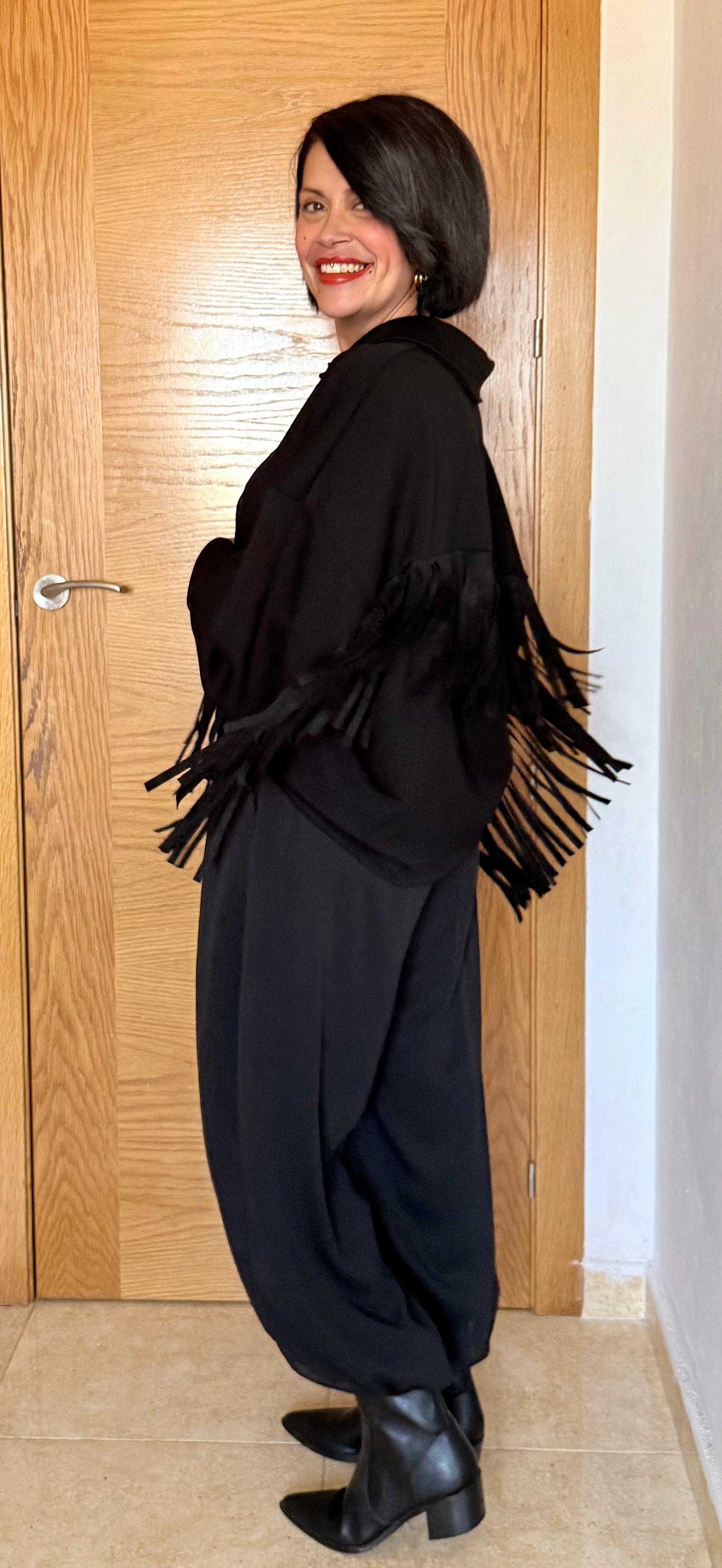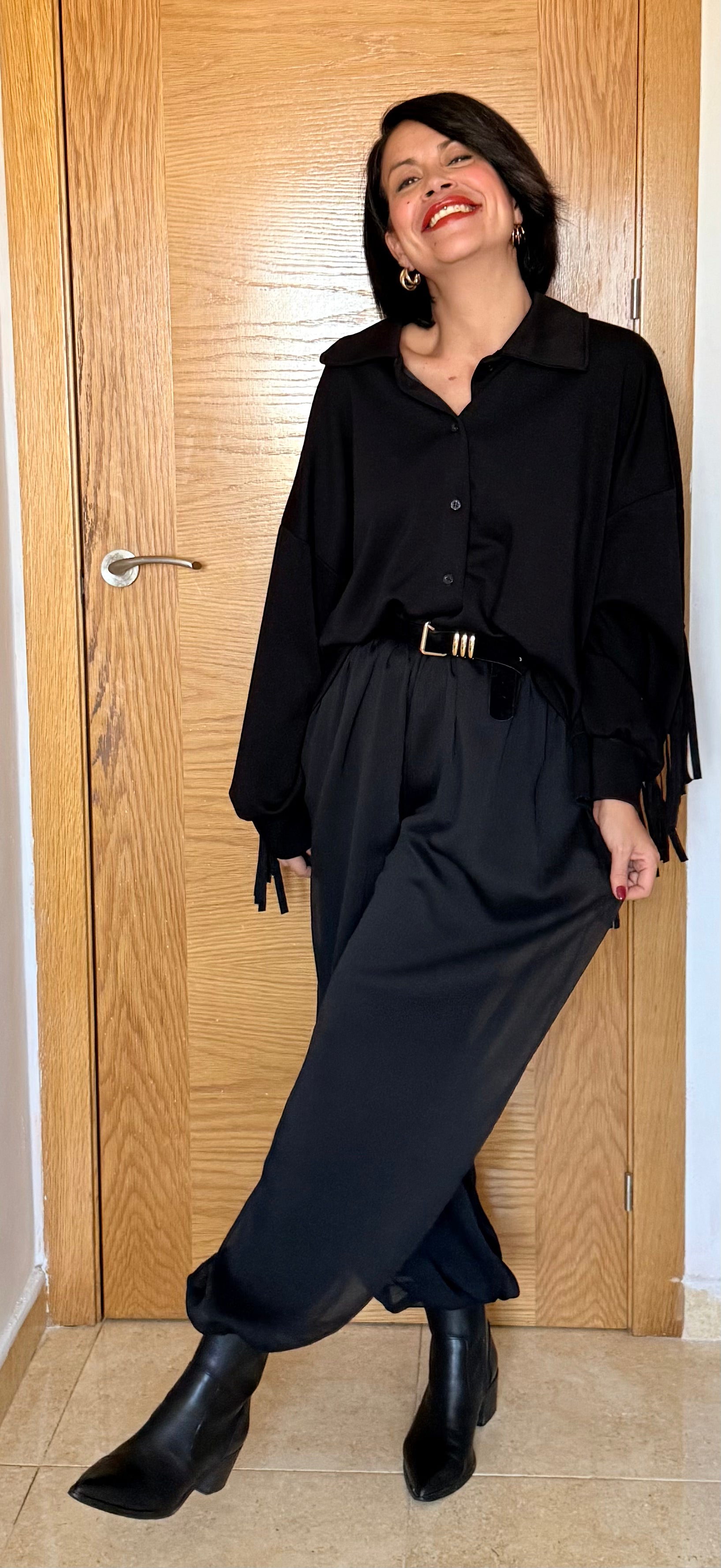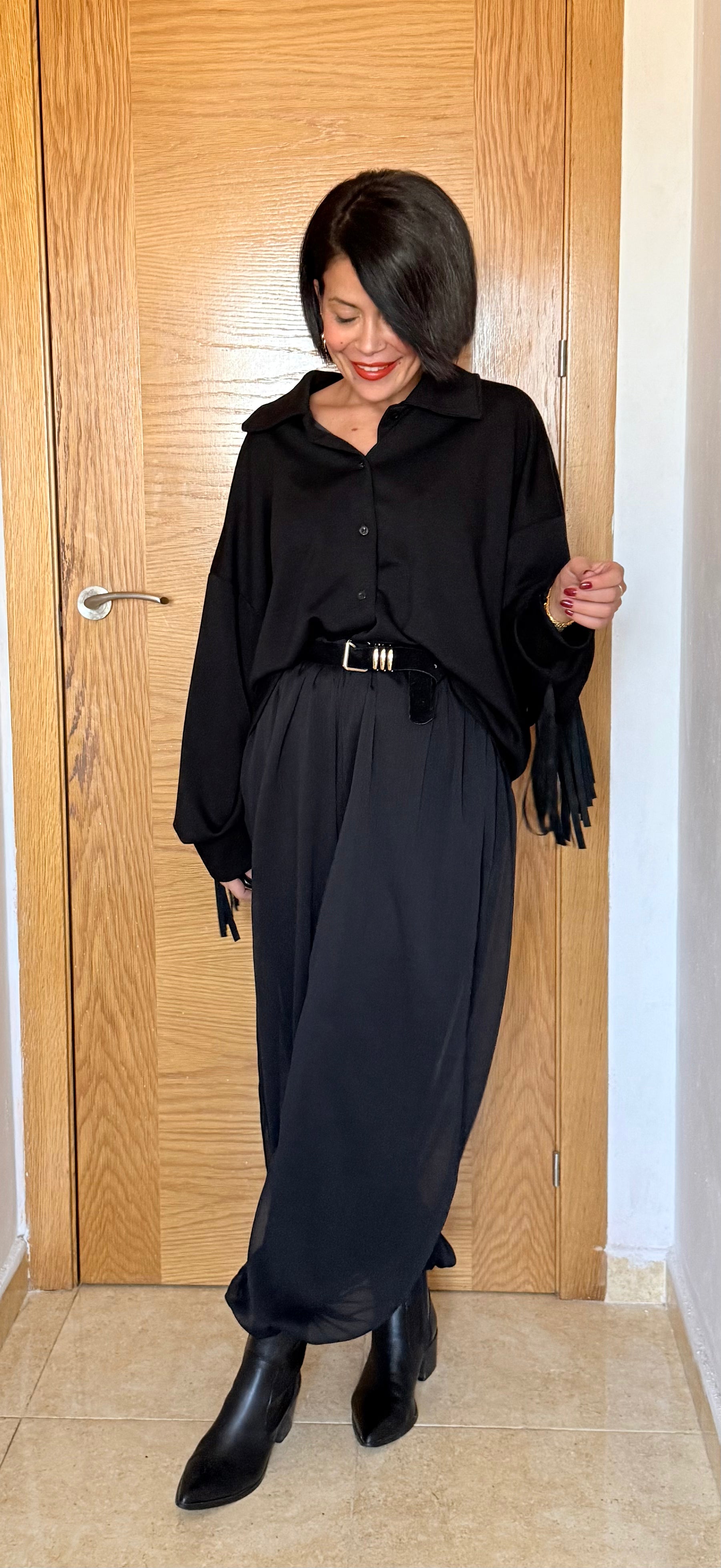 Camisa flecos negra, con un tacto muy suave, amplia y cómoda.