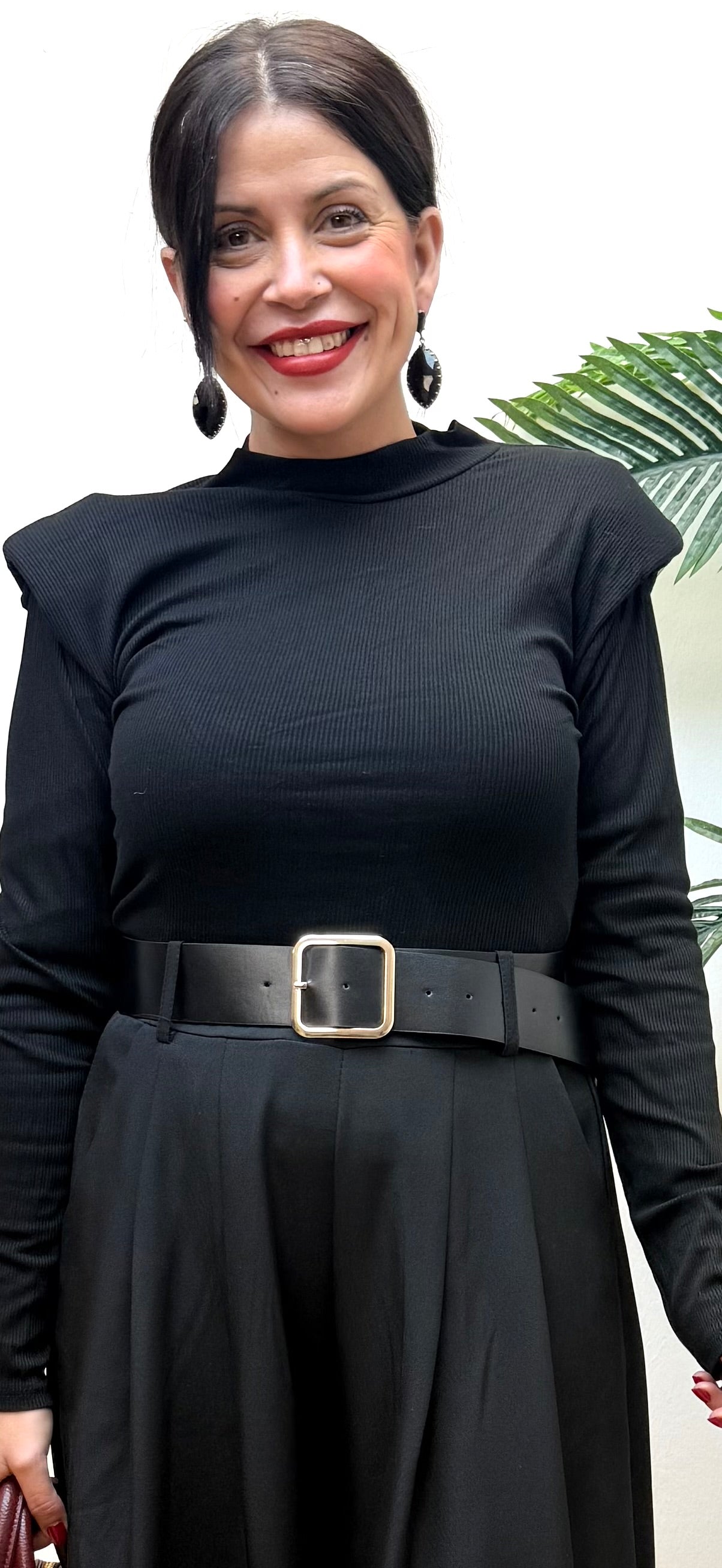 Camiseta hombreras lycra negra Alma, perfecta para combinar con jeans, pantalón de vestir o falda, una pieza clave y versátil que tienes que tener en tu armario.