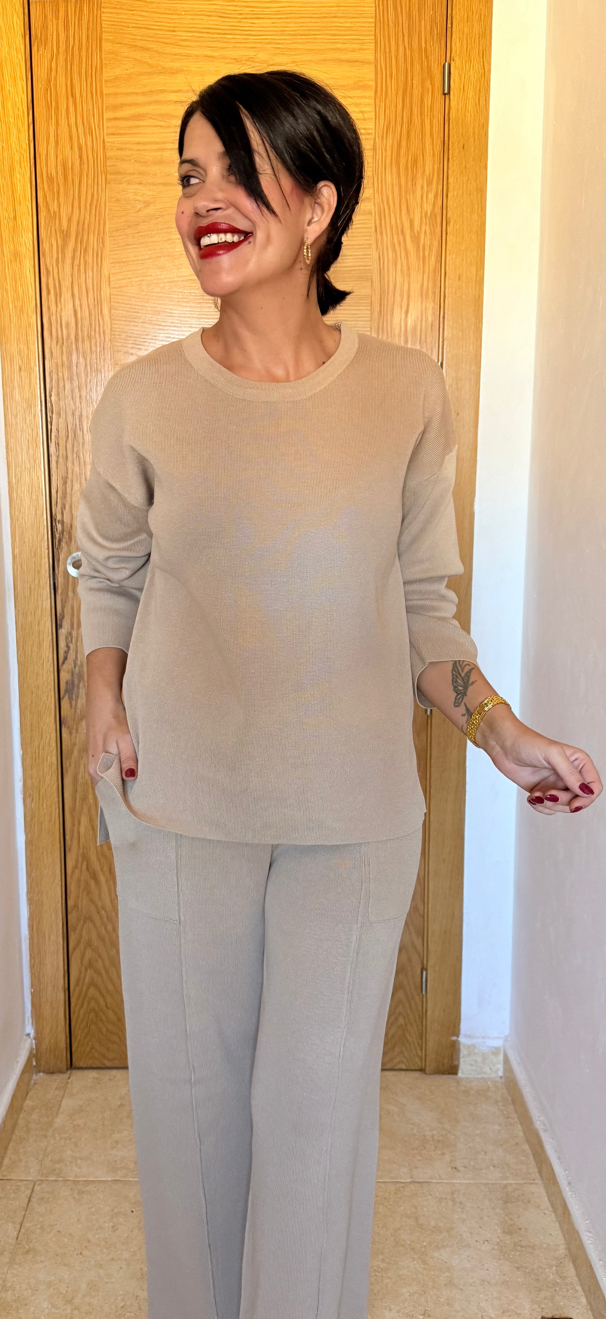 Conjunto crudo Toscana, conjunto de 2 piezas, la parte de arriba tiene el corte perfecto por ser recta y larga, además de amplia, y vienen en 2 tallas, comodidad, calidez y versatilidad.