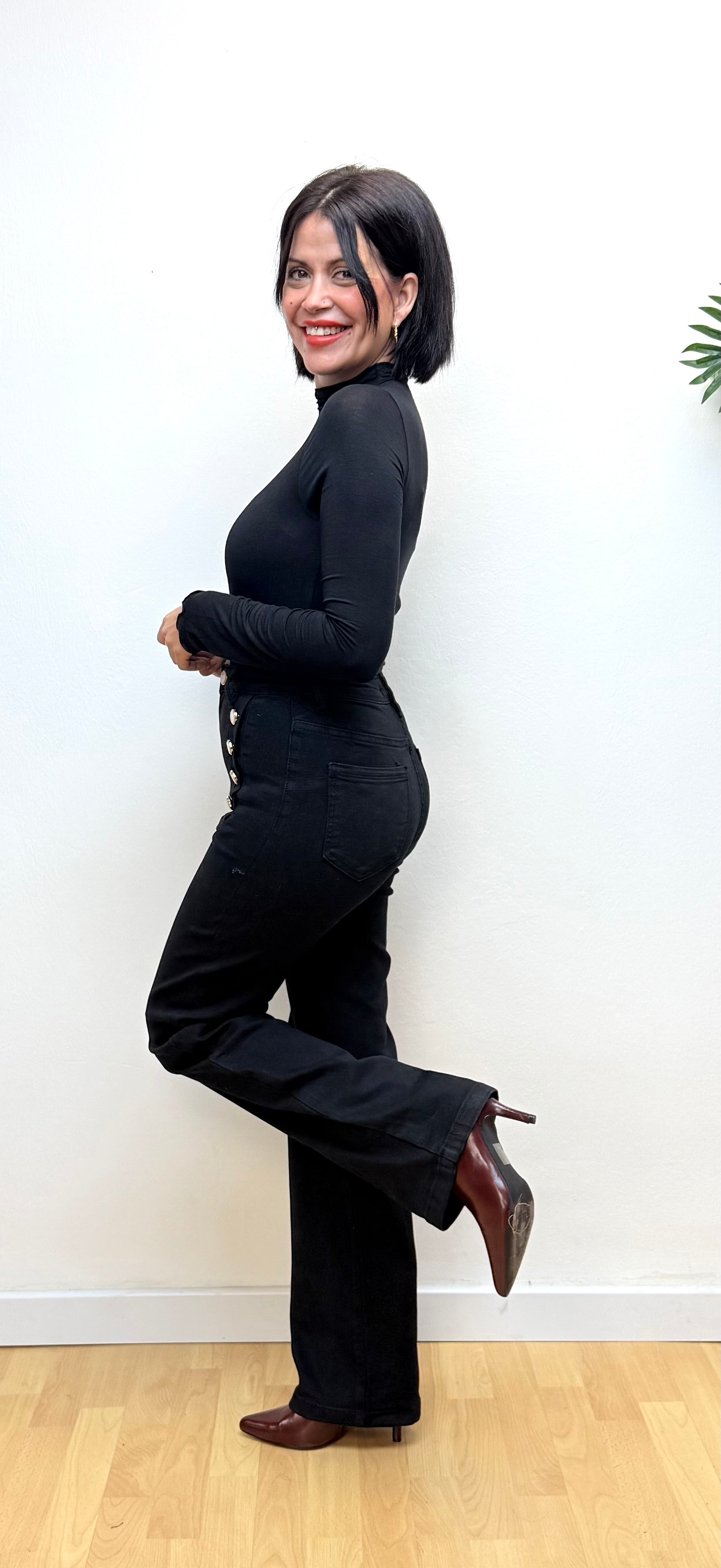 Jeans Botones negros Kelly, con un corte favorecedor, con botones delanteros perlados, cómodos y perfectos ya que es una prenda atemporal.