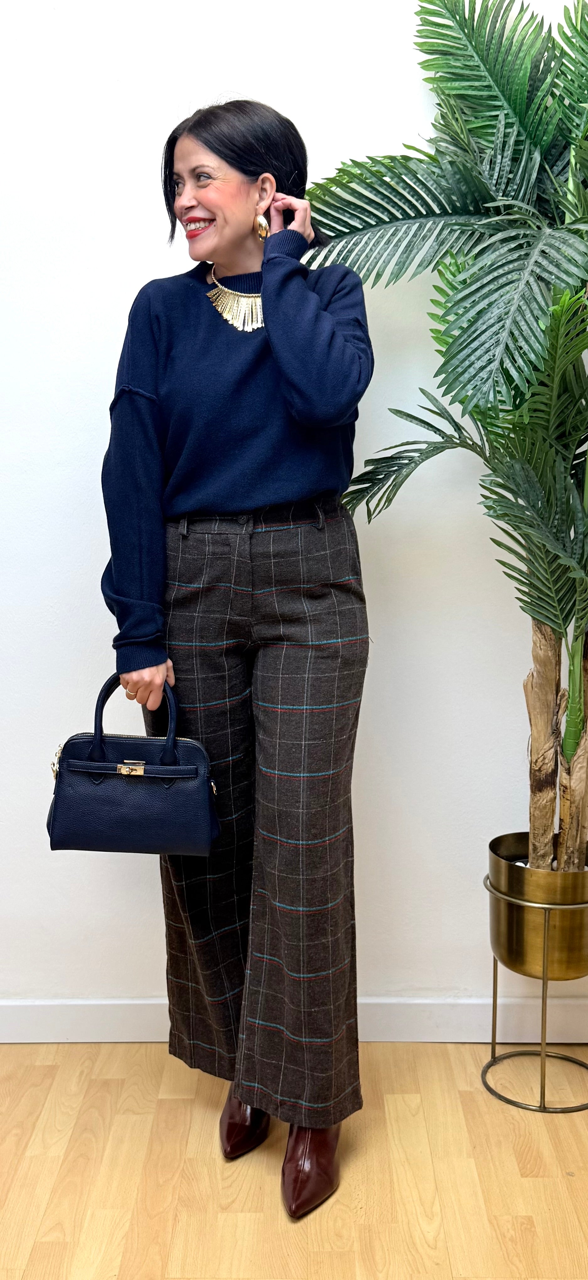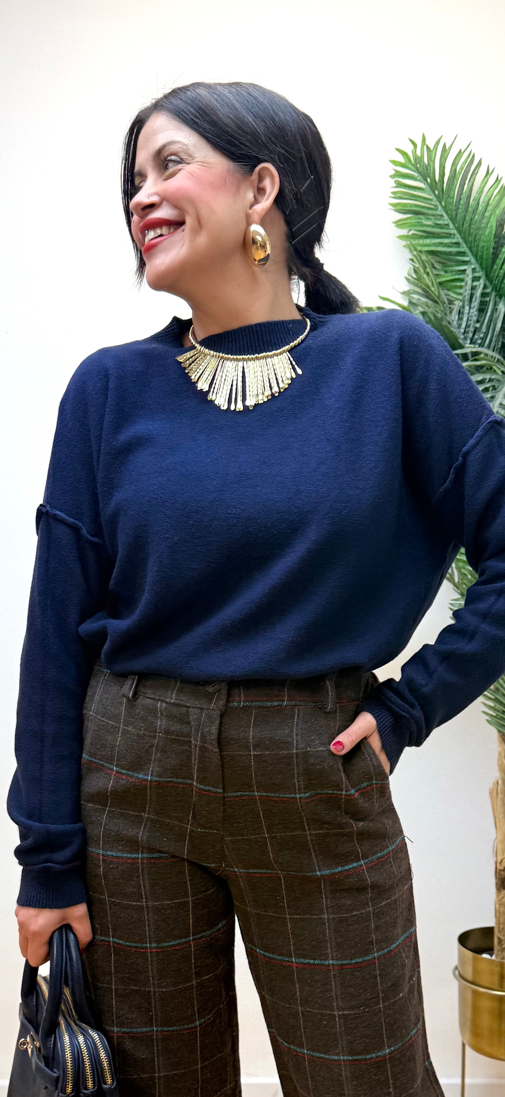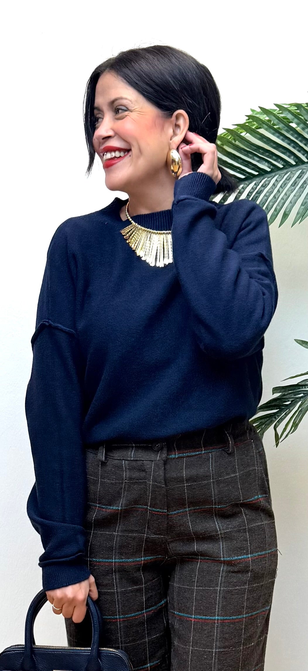 Jersey azul marino Viviana, un jersey de punto extra suave, con detalles de costura en la manga, es largo y amplio.