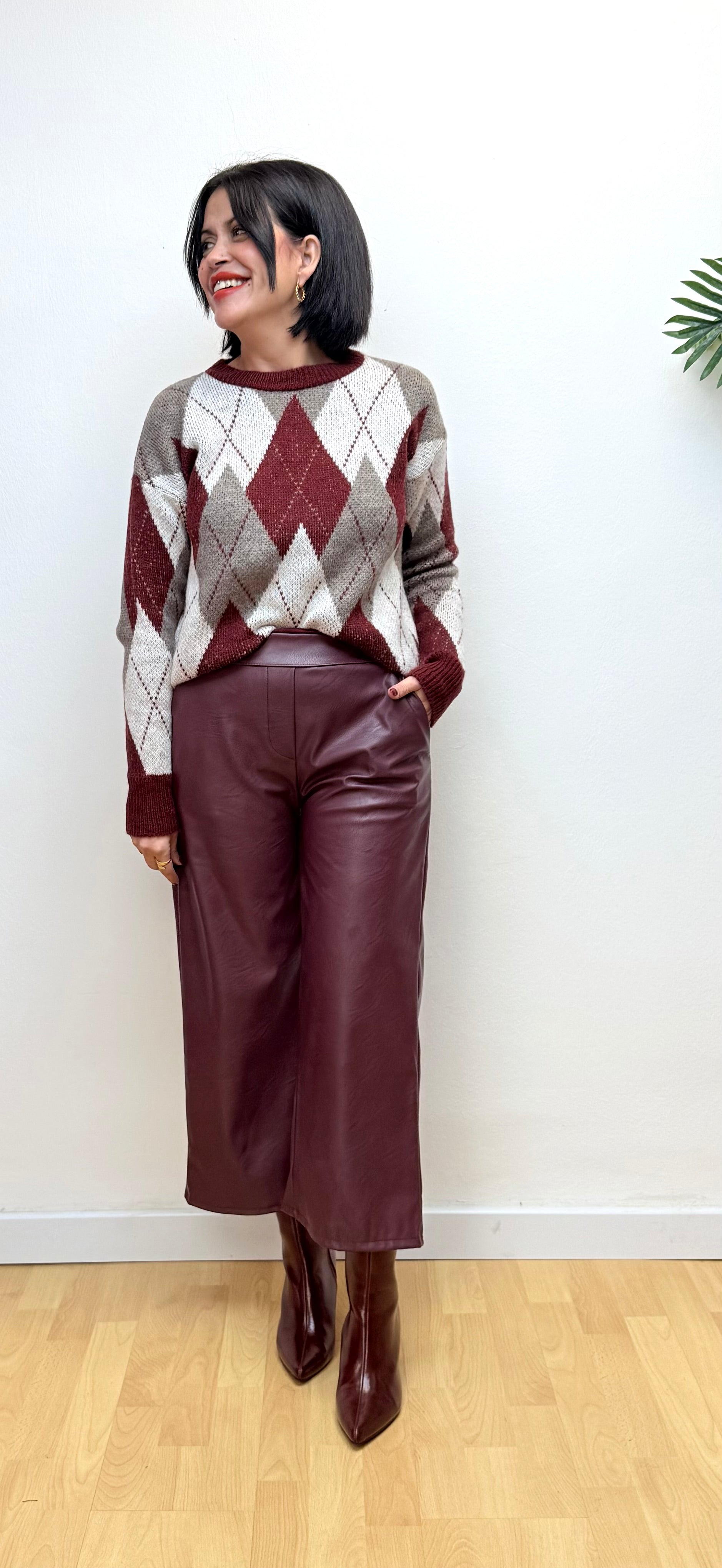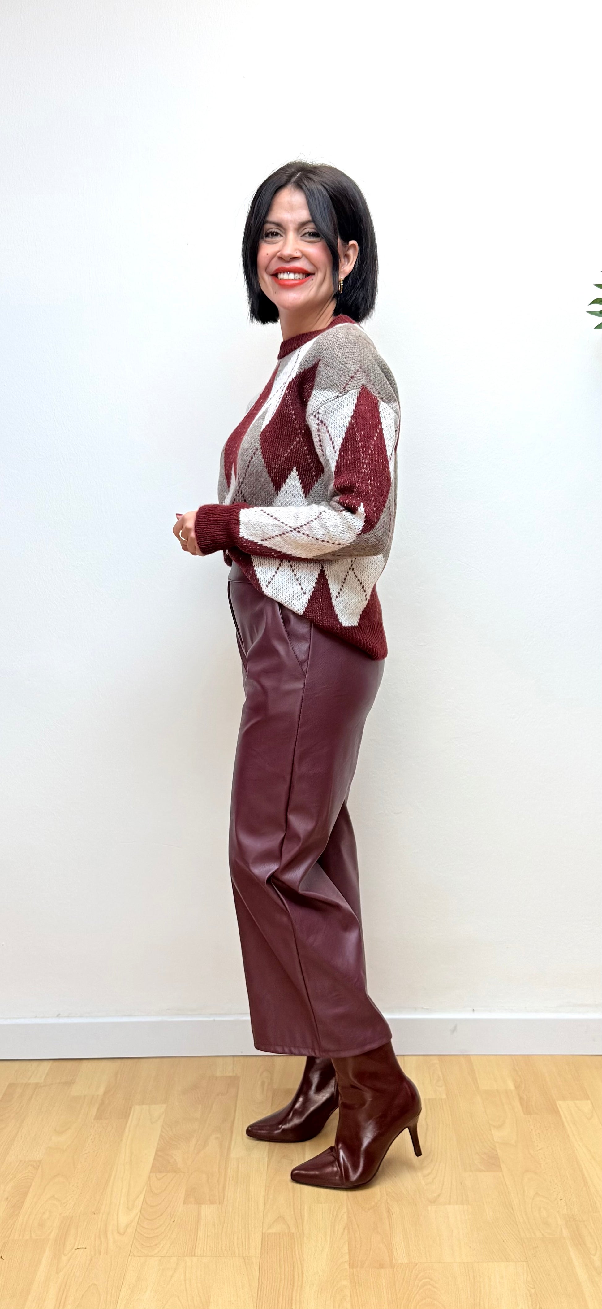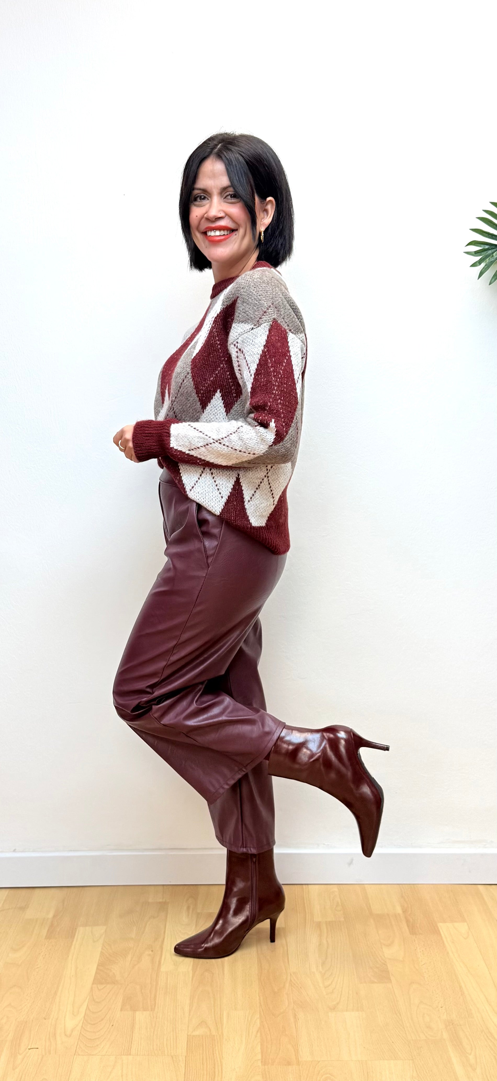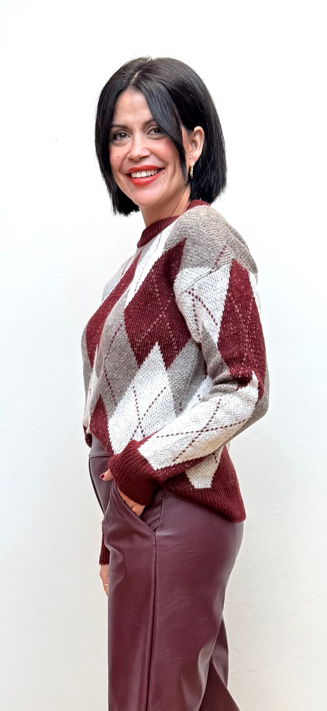 Jersey rombos burdeos Mía, llegó la tendencia de los rombos con unos colores super combinables, tanto con unos jeans ajustado como con una falda satinada.