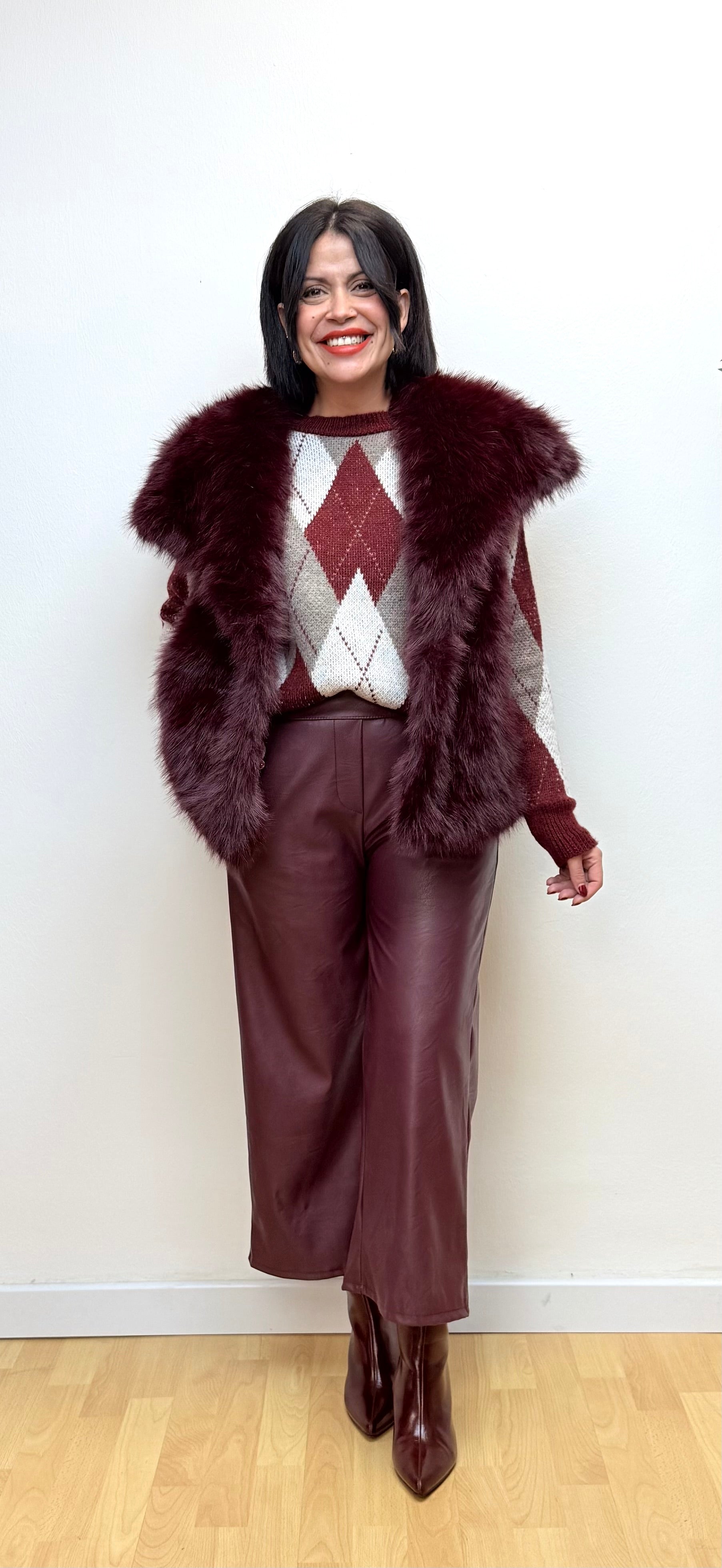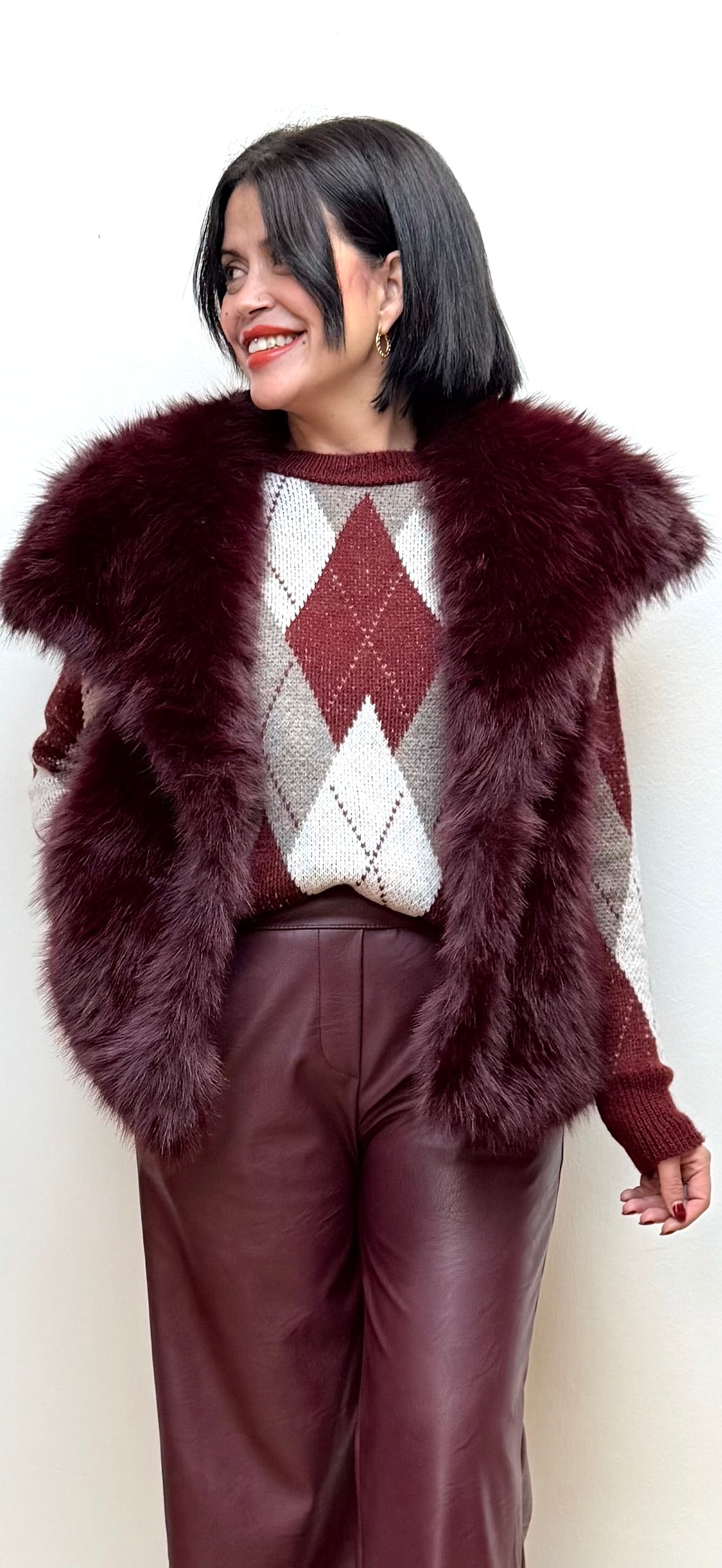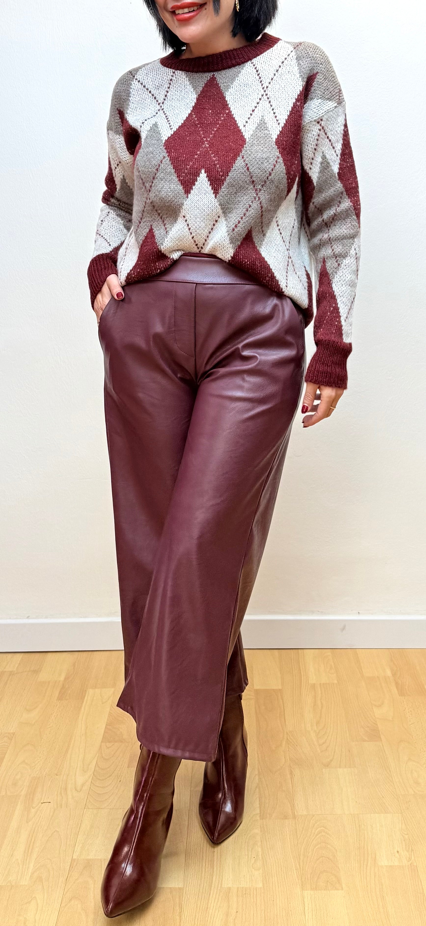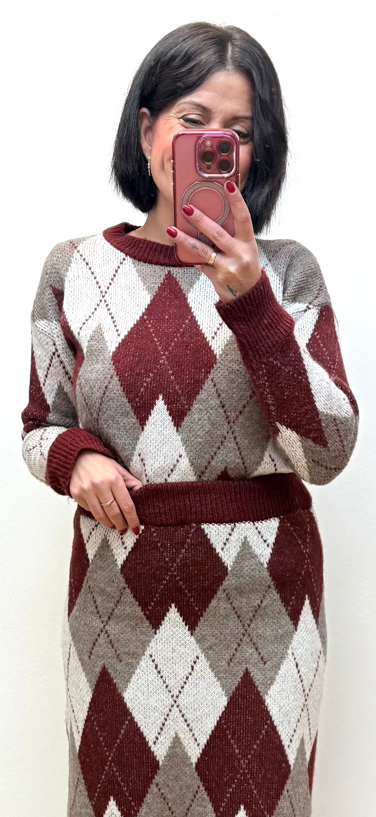 Jersey rombos burdeos Mía, llegó la tendencia de los rombos con unos colores super combinables, tanto con unos jeans ajustado como con una falda satinada.