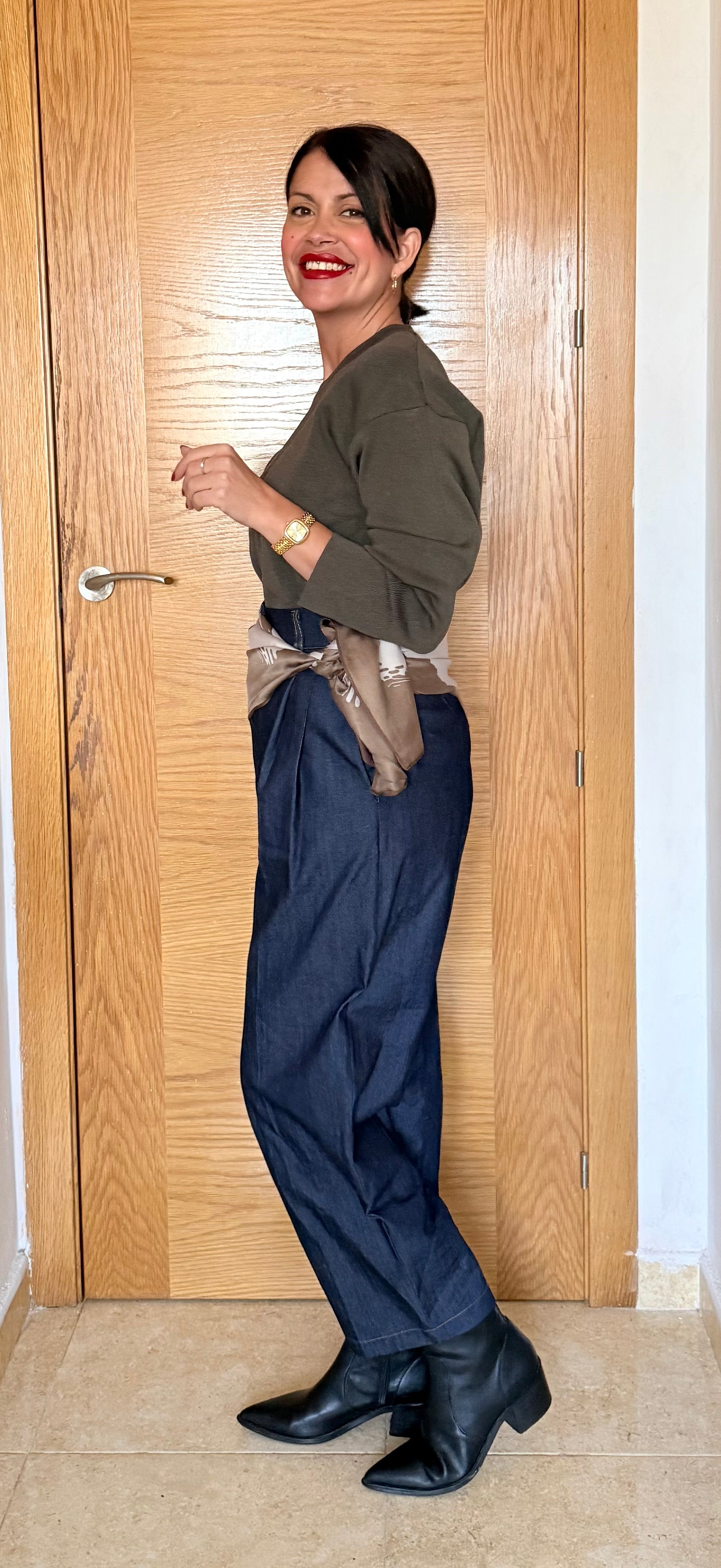 Pantalón vestir denim, con pinza delantera, de talle alto, es un jeans todoterreno.